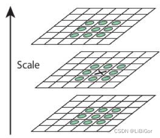 搜索过程从每组的第二层开始,以第二层为当前层,对第二层的DoG图像中的每个点取一个3×3的立方体,立方体上下层为第一层与第三层。这样,搜索得到的极值点既有位置坐标(DoG的图像坐标),又有空间尺度坐标(层坐标)。当第二层搜索完成后,再以第三层作为当前层,其过程与第二层的搜索类似。当S=3时,每组里面要搜索3层,所以在DOG中就有S+2层,在初使构建的金字塔中每组有S+3层。