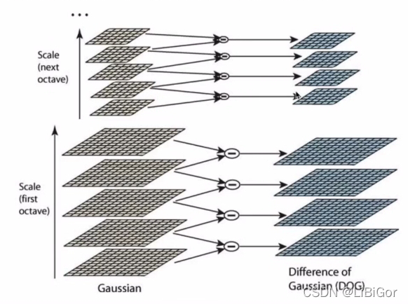 为了计算DoG我们构建高斯差分金字塔,该金字塔是在上述的高斯金字塔的基础上构建而成的,建立过程是:在高斯金字塔中每个Octave中相邻两层相减就构成了高斯差分金字塔。如下图所示: