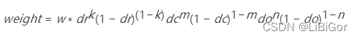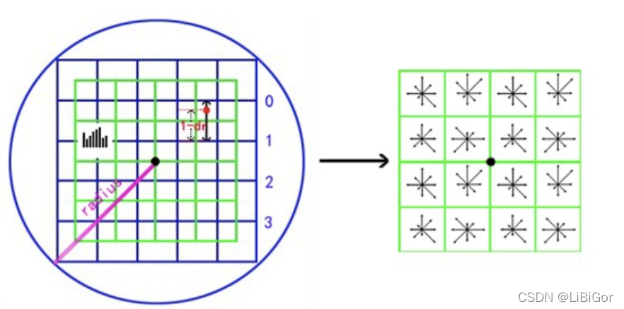 每个种子点的梯度都是由覆盖其的4个子区域插值而得的。如图中的红色点,落在第0行和第1行之间,对这两行都有贡献。对第0行第3列种子点的贡献因子为dr,对第1行第3列的贡献因子为1-dr,同理,对邻近两列的贡献因子为dc和1-dc,对邻近两个方向的贡献因子为do和1-do。则最终累加在每个方向上的梯度大小为: