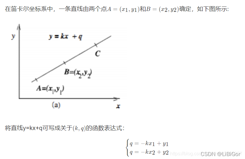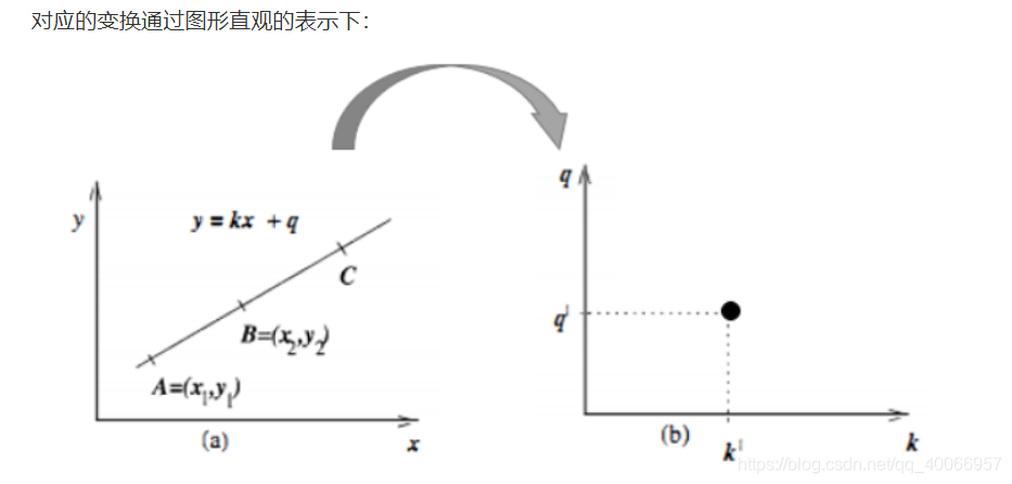 变换后的空间我们叫做霍夫空间。即:笛卡尔坐标系中的一条直线,对应于霍夫空间中的一个点。反过来,同样成立,霍夫空间中的一条线,对应于笛卡尔坐标系中一个点,如下所示:
