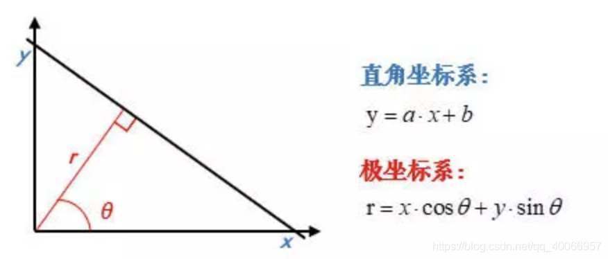 在极坐标下是一样的,极坐标中的点对应于霍夫空间的线,这时的霍夫空间是不在是参数(k,q)的空间,而是(ρ,θ)的空间,ρ是原点到直线的垂直距离,θ表示直线的垂线与横轴顺时针方向的夹角,垂直线的角度为0度,水平线的角度是180度。