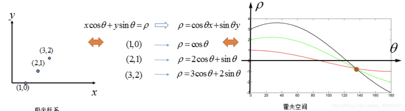 原理:将要检测的内容转换到霍夫空间中,利用累加器统计最优解,将检测结果表示处理