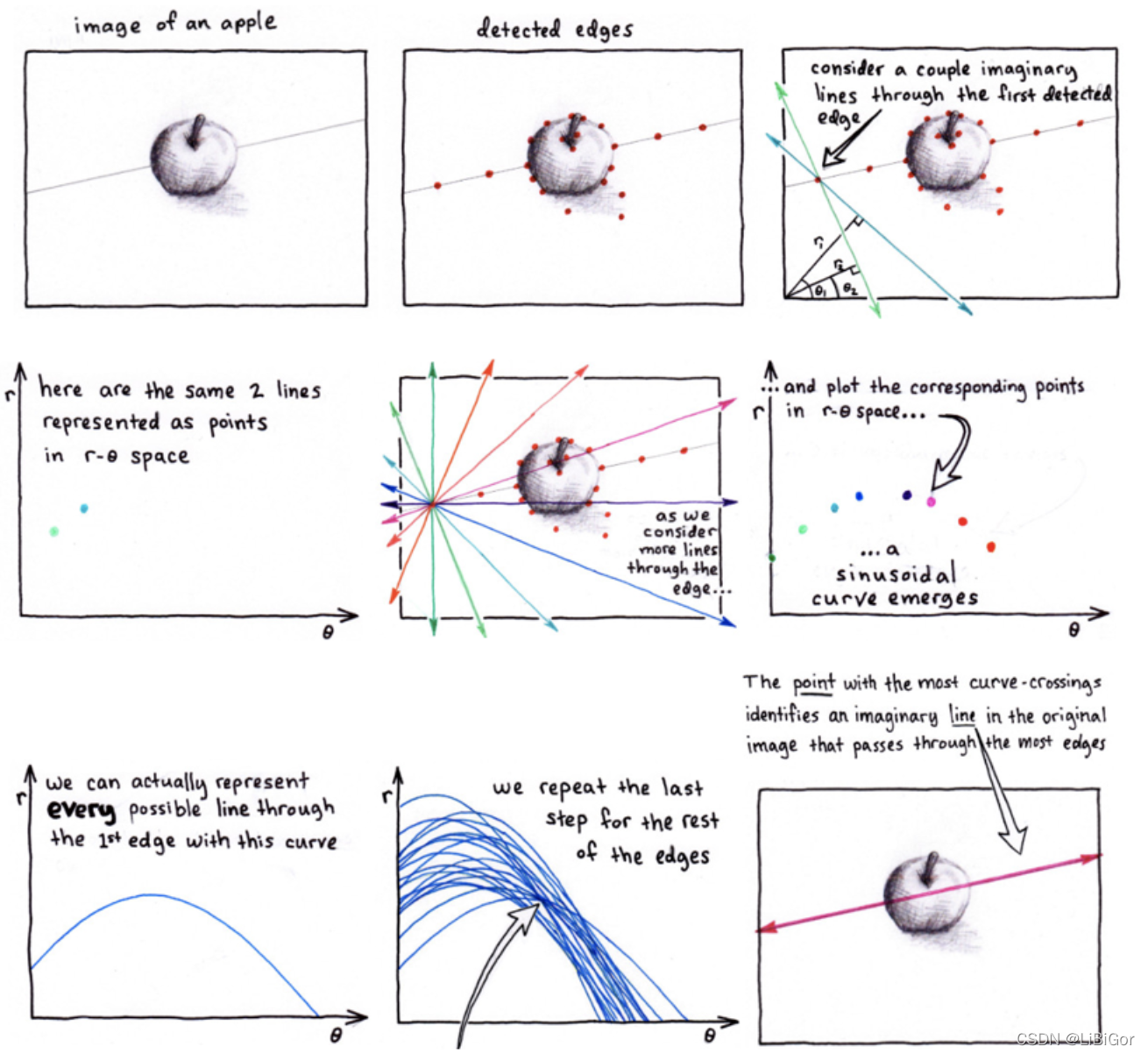 霍夫线检测的整个流程如下图所示,这是在stackflow上一个关于霍夫线变换的解释: