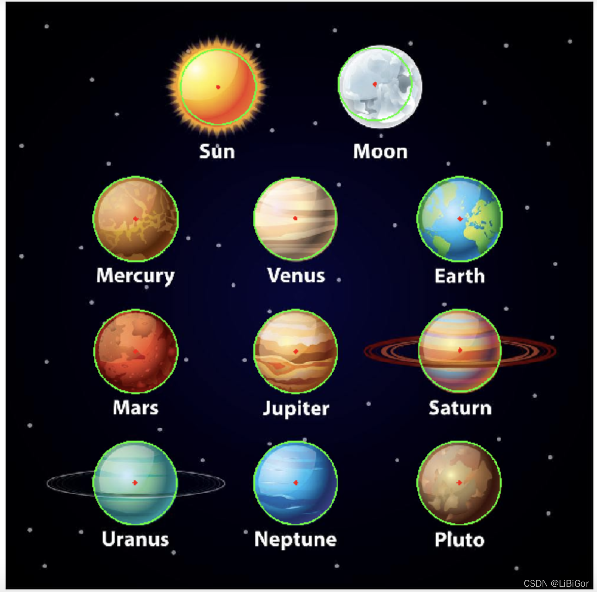 import cv2 as cv import numpy as np import matplotlib.pyplot as plt # 1 读取图像,并转换为灰度图 planets = cv.imread("./img/star.jpg") gay_img = cv.cvtColor(planets, cv.COLOR_BGRA2GRAY) # 2 进行中值模糊,去噪点 img = cv.medianBlur(gay_img, 7) # 3 霍夫圆检测 circles = cv.HoughCircles(img, cv.HOUGH_GRADIENT, 1, 200, param1=100, param2=30, minRadius=0, maxRadius=100) # 4 将检测结果绘制在图像上 for i in circles[0, :]: # 遍历矩阵每一行的数据# cvCircle(源图像指针, 画圆的圆心坐标,圆的半径,圆的颜色,圆的线条的粗细程度,线条的类型,圆心坐标点和半径值的小数点位数)# 绘制圆形cv.circle(planets, (i[0], i[1]), i[2], (0, 255, 0), 2)# 绘制圆心cv.circle(planets, (i[0], i[1]), 2, (0, 0, 255), 3) # 5 图像显示 plt.figure(figsize=(10,8),dpi=100) plt.imshow(planets[:,:,::-1]),plt.title('霍夫变换圆检测') plt.xticks([]), plt.yticks([]) plt.show()