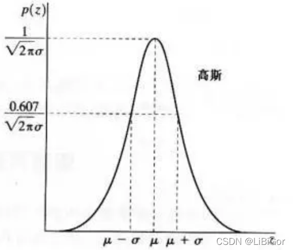 其中z表示灰度值,μ表示z的平均值或期望值,σ表示z的标准差。标准差的平方\sigma^{2}σ2称为z的方差。高斯函数的曲线如图所示。