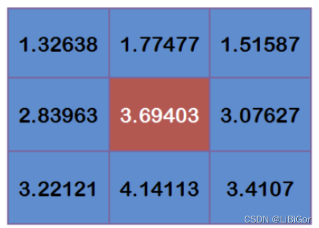 这9个点的权重总和等于0.4787147,如果只计算这9个点的加权平均,还必须让它们的权重之和等于1,因此上面9个值还要分别除以0.4787147,得到最终的权重矩阵。