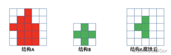 -  腐蚀 具体操作是:用一个结构元素扫描图像中的每一个像素,用结构元素中的每一个像素与其覆盖的像素做“与”操作,如果都为1,则该像素为1,否则为0。如下图所示,结构A被结构B腐蚀后: