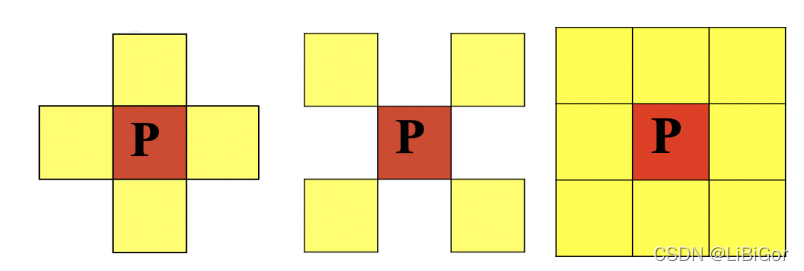 在图像中,最小的单位是像素,每个像素周围有8个邻接像素,常见的邻接关系有3种:4邻接、8邻接和D邻接。分别如下图所示: