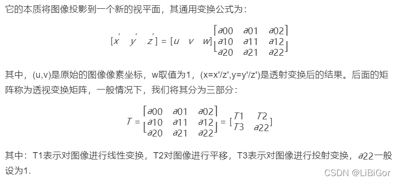 在opencv中,我们要找到四个点,其中任意三个不共线,然后获取变换矩阵T,再进行透射变换。通过函数cv.getPerspectiveTransform找到变换矩阵,将cv.warpPerspective应用于此3x3变换矩阵。