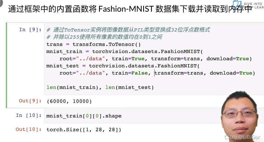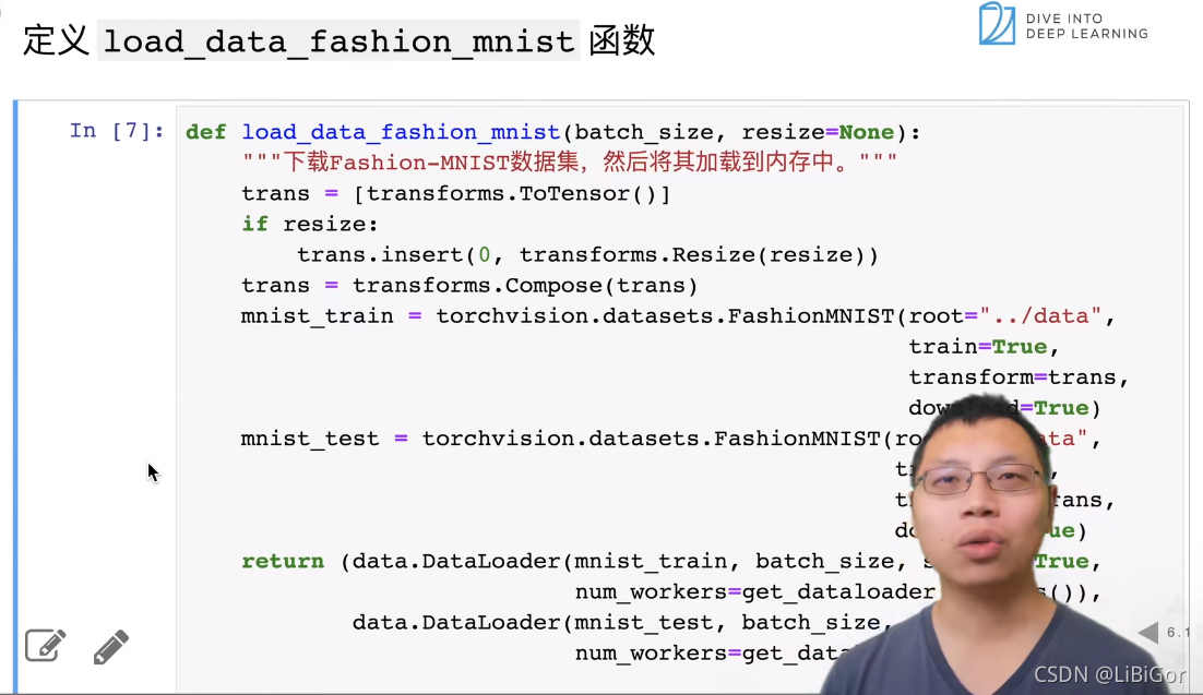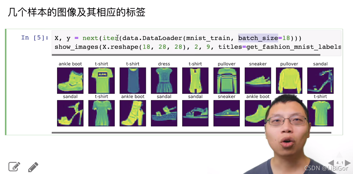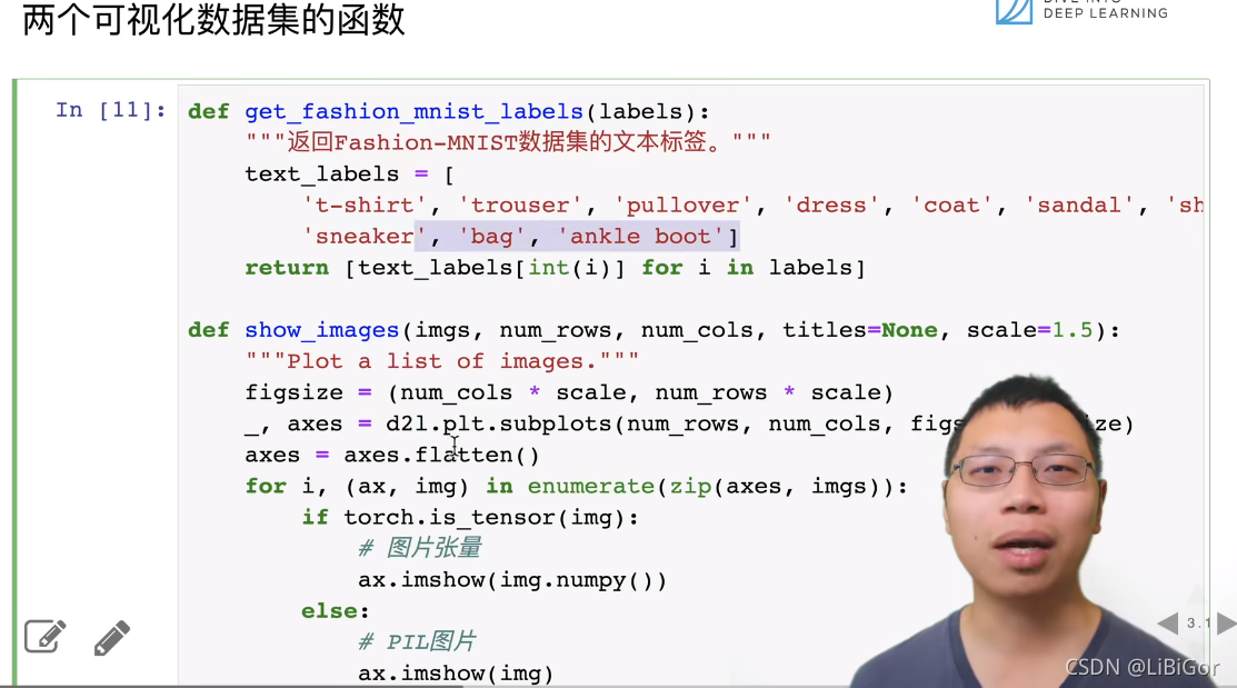 os.environ['KMP_DUPLICATE_LIB_OK'] = 'True' # 可能是由于是MacOS系统的原因def get_dataloader_workers():"""使用4个进程来读取数据"""return 4def load_data_fashion_mnist(batch_size, resize=None):"""下载Fashion-MNIST数据集,然后将其加载到内存中"""# 通过ToTensor实例将图像数据从PIL类型变换成32位浮点数格式# 并除以255使得所有像素的数值均在0到1之间trans = [transforms.ToTensor()]if resize:trans.insert(0, transforms.Resize(resize))trans = transforms.Compose(trans)mnist_train = torchvision.datasets.FashionMNIST(root="../data", train=True, transform=trans, download=True)mnist_test = torchvision.datasets.FashionMNIST(root="../data", train=False, transform=trans, download=True)return (data.DataLoader(mnist_train, batch_size, shuffle=True,num_workers=get_dataloader_workers()),data.DataLoader(mnist_test, batch_size, shuffle=False,num_workers=get_dataloader_workers()))def get_fashion_mnist_labels(labels):"""返回Fashion-MNIST数据集的文本标签"""text_labels = ['t-shirt', 'trouser', 'pullover', 'dress', 'coat','sandal', 'shirt', 'sneaker', 'bag', 'ankle boot']return [text_labels[int(i)] for i in labels]def show_images(imgs, num_rows, num_cols, titles=None, scale=1.5): #@save"""绘制图像列表"""figsize = (num_cols * scale, num_rows * scale)_, axes = d2l.plt.subplots(num_rows, num_cols, figsize=figsize)axes = axes.flatten()for i, (ax, img) in enumerate(zip(axes, imgs)):if torch.is_tensor(img):# 图片张量ax.imshow(img.numpy())else:# PIL图片ax.imshow(img)ax.axes.get_xaxis().set_visible(False)ax.axes.get_yaxis().set_visible(False)if titles:ax.set_title(titles[i])return axes