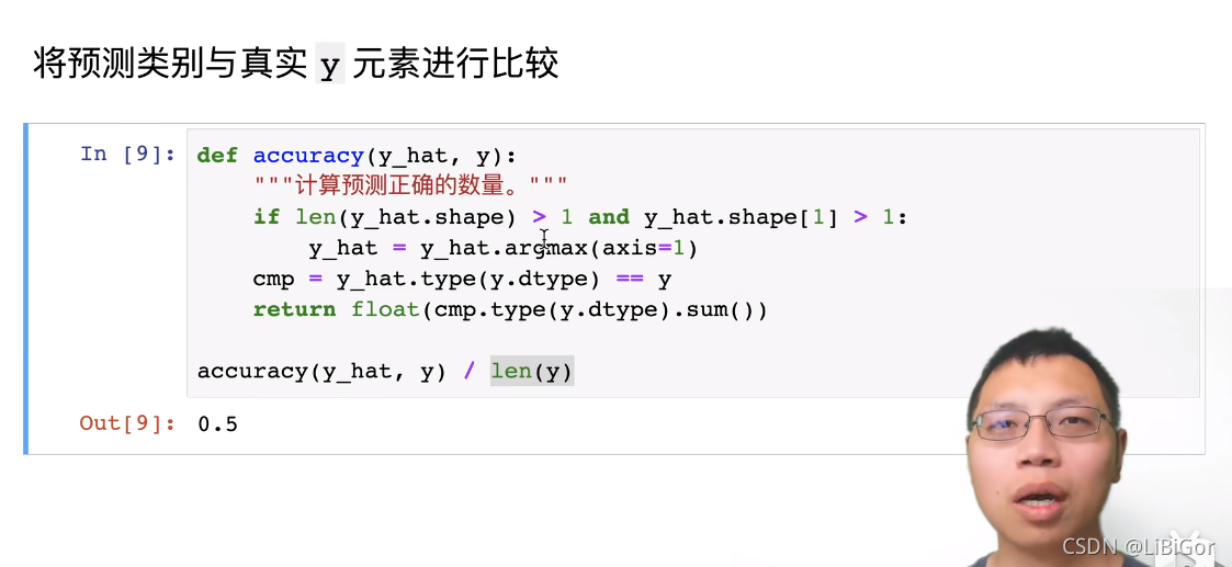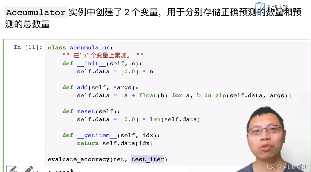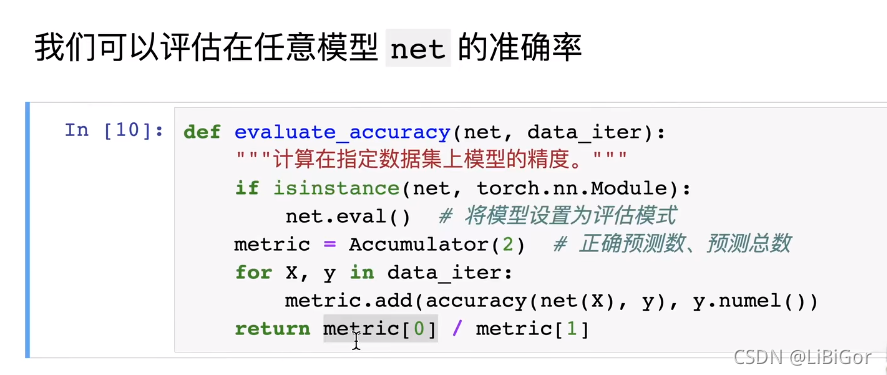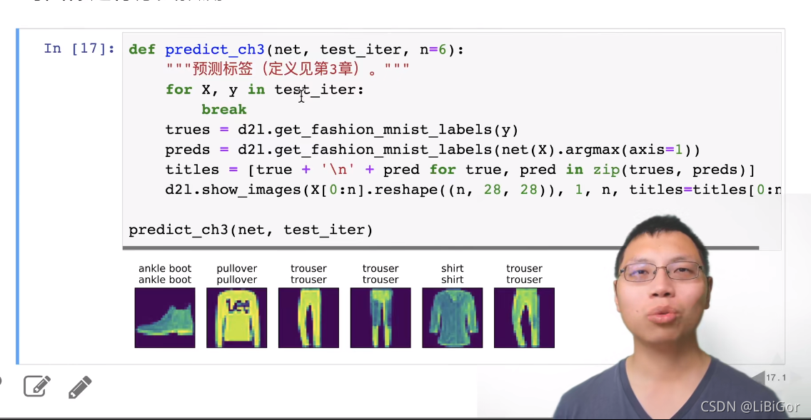 在训练softmax回归模型后,给出任何样本特征,我们可以预测每个输出类别的概率。 通常我们使用预测概率最高的类别作为输出类别。 如果预测与实际类别(标签)一致,则预测是正确的。 在接下来的实验中,我们将使用精度(accuracy)来评估模型的性能。 精度等于正确预测数与预测总数之间的比率。