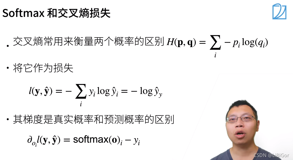 由于y是一个长度为q的独热编码向量, 所以除了一个项以外的所有项j都消失了。 由于所有y^j都是预测的概率,所以它们的对数永远不会大于0。 因此,如果正确地预测实际标签,即如果实际标签P(y∣x)=1, 则损失函数不能进一步最小化。 注意,这往往是不可能的。 例如,数据集中可能存在标签噪声(比如某些样本可能被误标), 或输入特征没有足够的信息来完美地对每一个样本分类。