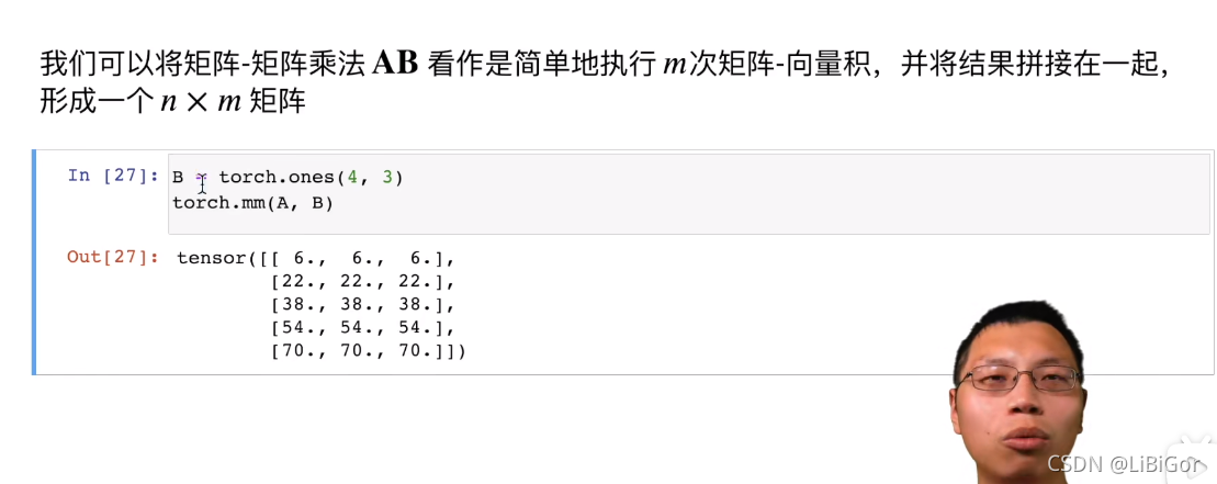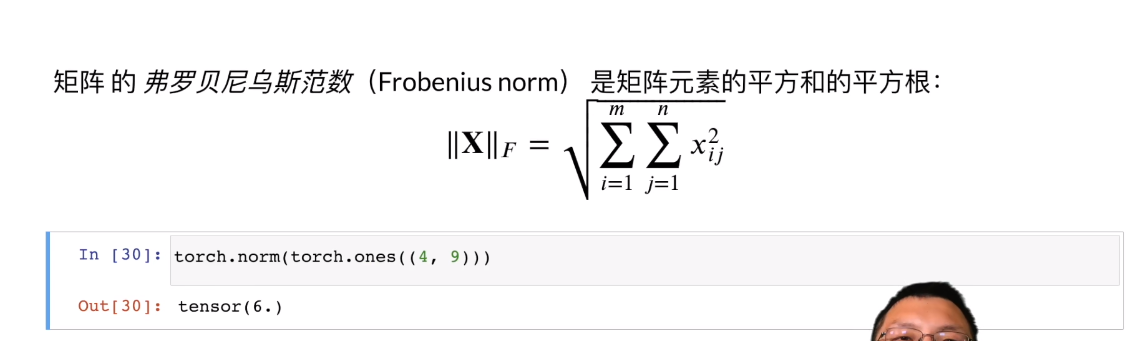 一个与求和相关的量是平均值(mean或average)。我们通过将总和除以元素总数来计算平均值。在代码中,我们可以调用函数来计算任意形状张量的平均值。