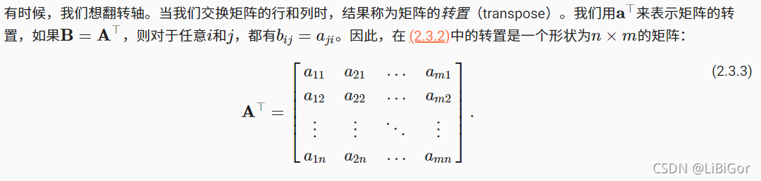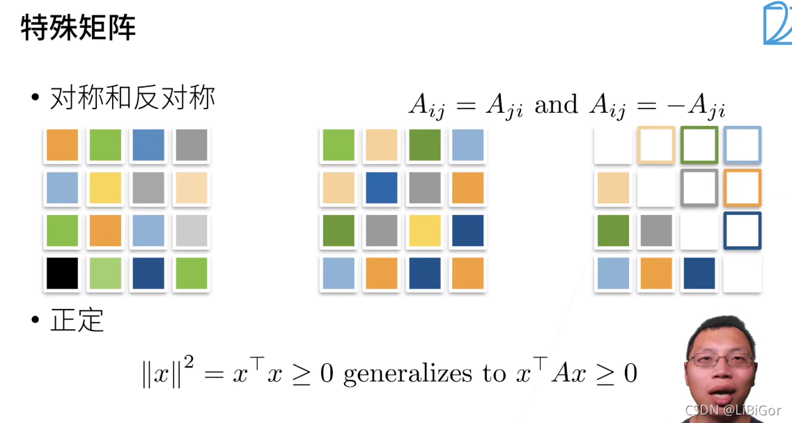 作为方矩阵的一种特殊类型,对称矩阵(symmetric matrix)AA等于其转置:A=A⊤A=A⊤。这里我们定义一个对称矩阵BB: