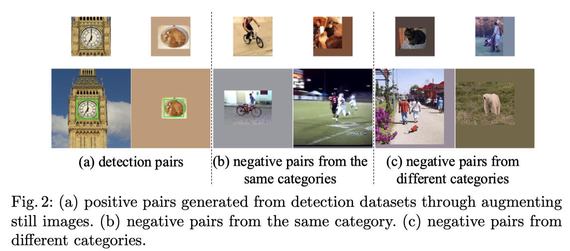 基于上面这个理论,为目标追踪算法添加了一些数据对,用于增强算法的判别能力,其中,Detection pairs:提出使用ImageNet Detection和COCO数据集,通过一些数据增强技术构造出样本对,这类样本对用于提高模型的泛化能力。其次,使用来自相同类别的负样本对。如下图中(b)。最后,使用来自不同类别的负样本对。如下图中(c)。添加这两类负样本可以使模型在超出视线、全遮挡的情况下,避免模型漂移到其他的目标上去。这两类样本对用于提高模型的判别能力。