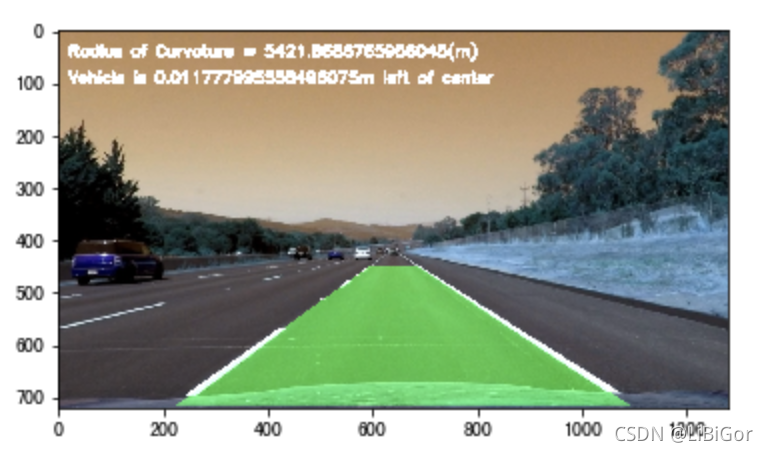 def cal_center_departure(img, left_fit, right_fit):# 计算中心点y_max = img.shape[0]left_x = left_fit[0] * y_max ** 2 + left_fit[1] * y_max + left_fit[2]right_x = right_fit[0] * y_max ** 2 + right_fit[1] * y_max + right_fit[2]xm_per_pix = 3.7 / 700center_depart = ((left_x + right_x) / 2 - lane_center) * xm_per_pix# 在图像上显示偏移if center_depart > 0:cv2.putText(img, 'Vehicle is {}m right of center'.format(center_depart), (20, 100), cv2.FONT_ITALIC, 1,(255, 255, 255), 5)elif center_depart < 0:cv2.putText(img, 'Vehicle is {}m left of center'.format(-center_depart), (20, 100), cv2.FONT_ITALIC, 1,(255, 255, 255), 5)else:cv2.putText(img, 'Vehicle is in the center', (20, 100), cv2.FONT_ITALIC, 1, (255, 255, 255), 5)return img
