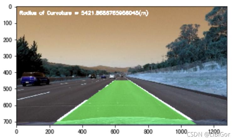 def cal_radius(img, left_fit, right_fit):# 图像中像素个数与实际中距离的比率# 沿车行进的方向长度大概覆盖了30米,按照美国高速公路的标准,宽度为3.7米(经验值)ym_per_pix = 30 / 720 # y方向像素个数与距离的比例xm_per_pix = 3.7 / 700 # x方向像素个数与距离的比例# 计算得到曲线上的每个点left_y_axis = np.linspace(0, img.shape[0], img.shape[0] - 1)left_x_axis = left_fit[0] * left_y_axis ** 2 + left_fit[1] * left_y_axis + left_fit[2]right_y_axis = np.linspace(0, img.shape[0], img.shape[0] - 1)right_x_axis = right_fit[0] * right_y_axis ** 2 + right_fit[1] * right_y_axis + right_fit[2]# 获取真实环境中的曲线left_fit_cr = np.polyfit(left_y_axis * ym_per_pix, left_x_axis * xm_per_pix, 2)right_fit_cr = np.polyfit(right_y_axis * ym_per_pix, right_x_axis * xm_per_pix, 2)# 获得真实环境中的曲线曲率left_curverad = ((1 + (2 * left_fit_cr[0] * left_y_axis * ym_per_pix + left_fit_cr[1]) ** 2) ** 1.5) / np.absolute(2 * left_fit_cr[0])right_curverad = ((1 + (2 * right_fit_cr[0] * right_y_axis * ym_per_pix + right_fit_cr[1]) ** 2) ** 1.5) / np.absolute(2 * right_fit_cr[0])# 在图像上显示曲率cv2.putText(img, 'Radius of Curvature = {}(m)'.format(np.mean(left_curverad)), (20, 50), cv2.FONT_ITALIC, 1,(255, 255, 255), 5)return img