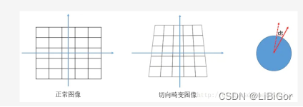 切向畸变是由于透镜本身与相机传感器平面(像平面)或图像平面不平行而产生的,这种情况多是由于透镜被粘贴到镜头模组上的安装偏差导致。在相机传感器和镜头不平行的情况下,因为存在夹角,所以光透过镜头传到图像传感器上时,成像位置发生了变化,如下图所示: