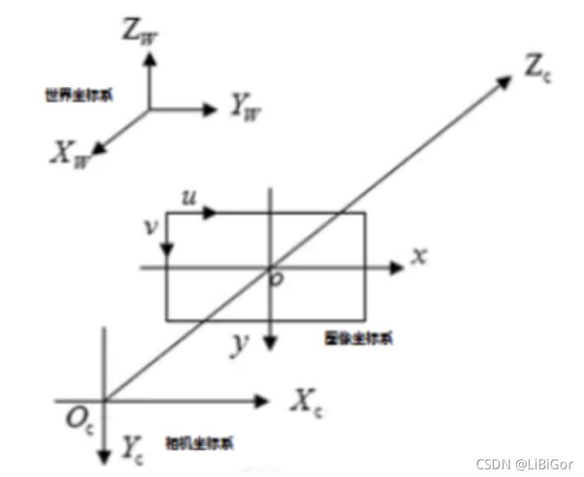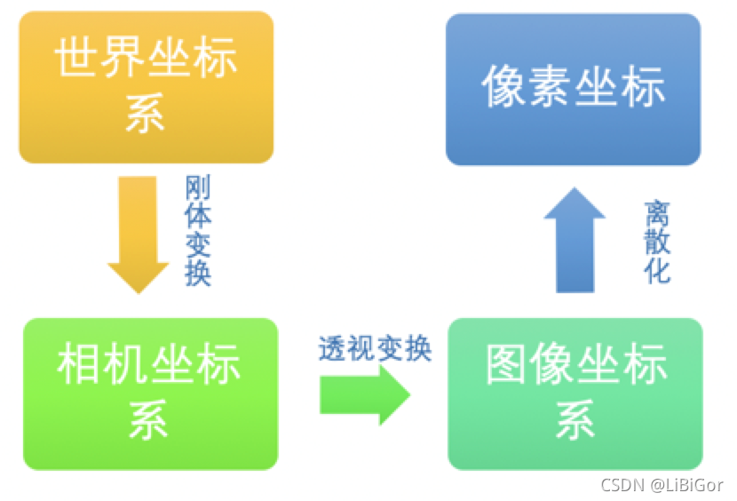 下面我们进行一系列的变换,引入多个参数矩阵,实现从世界坐标系到像素坐标的转换。已知一个现实世界中的物体点的在世界坐标系中的坐标为(Xw, Yw, Zw),经过相机拍摄得到图片,在图片上的像素坐标为(u , v )。假设在图像坐标系中的坐标为( x , y ),在相机坐标系中的坐标为(Xc, Yc, Zc)。各个坐标之间的转化流程如下图所示: