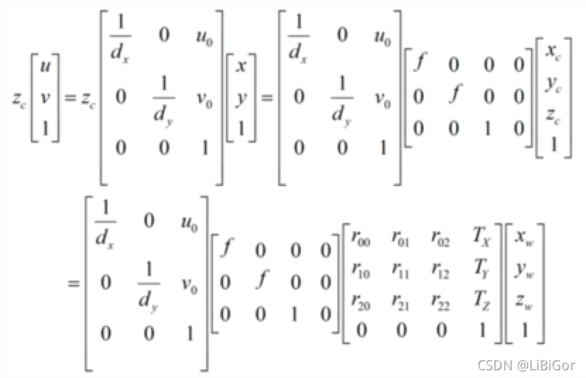 我们已经介绍了各个坐标系之间的转换过程,但是我们想知道的是如何从世界坐标系转换到像素坐标系,因此我们需要把上面介绍到的联系起来,将三者相乘,可以把这三个过程和在一起,写成一个矩阵: