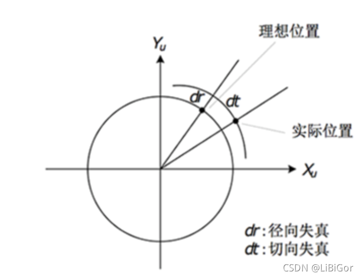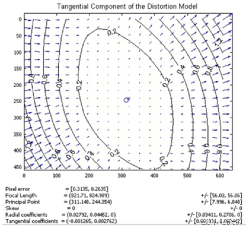 下图显示某个透镜的切向畸变示意图,大体上畸变位移相对于左下—右上角的连线是对称的,这跟凸透镜与传感器之间的夹角有关: