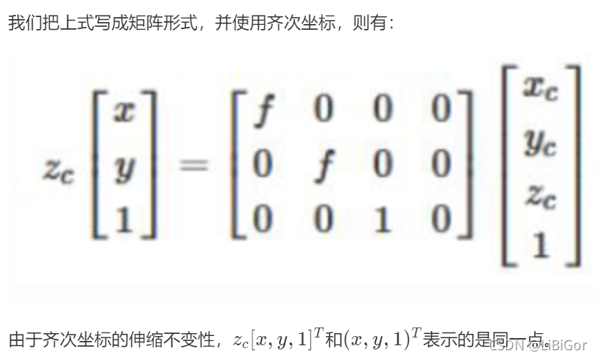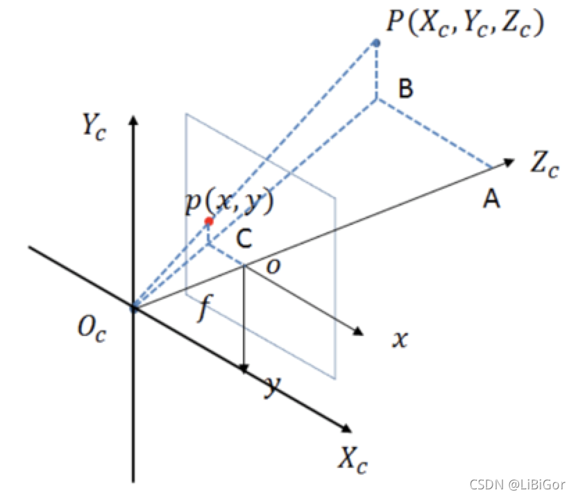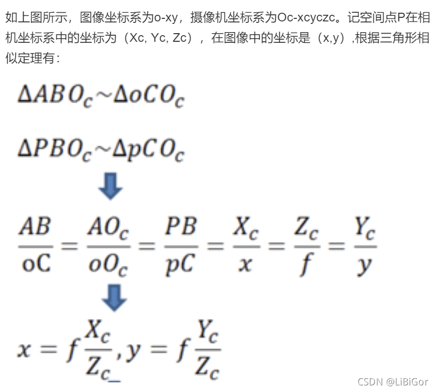 从相机坐标系到图像坐标系,是从3d到2d的过程,属于透射投影关系: