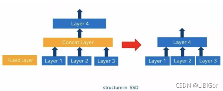 如上图所示,原始的网络结构把三个层的输出通过连接层连接之后输入到后续层,这种情况可以把中间的连接层直接去掉,将三个网络层输出直接接到第四层的输入上面,这种网络结构多出现SSD类型的网络架构当中。