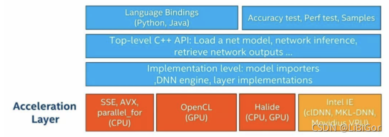 - 第四层:加速层,包括CPU加速、GPU加速、Halide加速和Intel推理引擎加速。CPU加速用到了SSE和AVX指令以及大量的多线程元语,而OpenCL加速是针对GPU进行并行运算的加速。Halide是一个实验性的实现,并且性能一般。Intel推理引擎加速需要安装OpenVINO库,它可以实现在CPU、GPU和VPU上的加速,在GPU上内部会调用clDNN库来做GPU上的加速,在CPU上内部会调用MKL-DNN来做CPU加速,而Movidius主要是在VPU上使用的专用库来进行加速。
