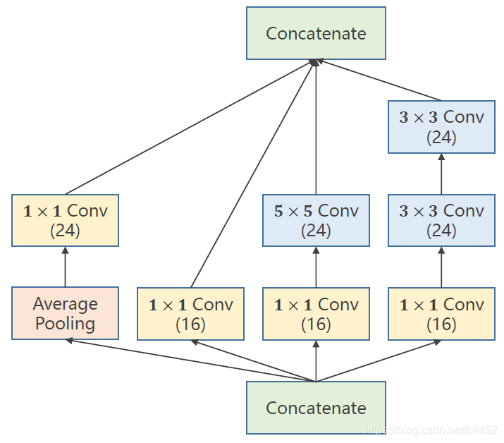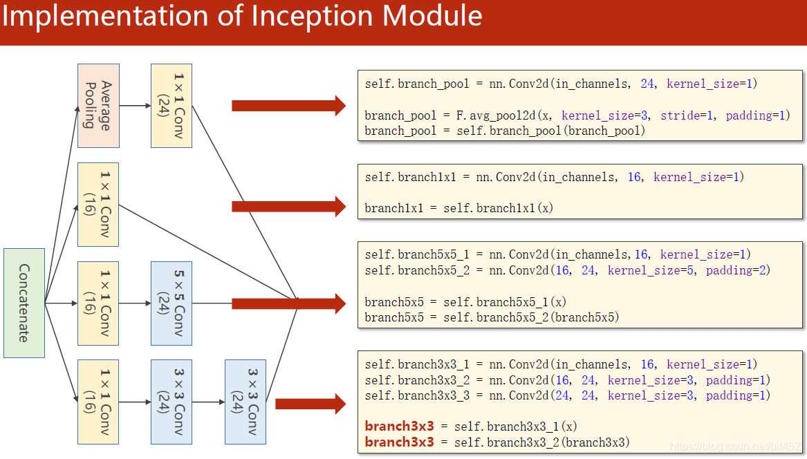 3、Inception Moudel由4个分支组成,要分清哪些是在Init里定义,哪些是在forward里调用。4个分支在dim=1(channels)上进行concatenate。24+16+24+24 = 88