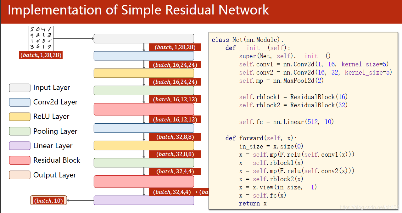 class ResidualBlock(nn.Module):def __init__(self, channels):super(ResidualBlock, self).__init__()self.channels = channelsself.conv1 = nn.Conv2d(channels, channels, kernel_size=3, padding=1)self.conv2 = nn.Conv2d(channels, channels, kernel_size=3, padding=1)def forward(self, x):y = F.relu(self.conv1(x))y = self.conv2(y)return F.relu(x + y)class Net(nn.Module):def __init__(self):super(Net, self).__init__()self.conv1 = nn.Conv2d(1, 16, kernel_size=5)self.conv2 = nn.Conv2d(16, 32, kernel_size=5) # 88 = 24x3 + 16self.rblock1 = ResidualBlock(16)self.rblock2 = ResidualBlock(32)self.mp = nn.MaxPool2d(2)self.fc = nn.Linear(512, 10) # 暂时不知道1408咋能自动出来的def forward(self, x):in_size = x.size(0)x = self.mp(F.relu(self.conv1(x)))x = self.rblock1(x)x = self.mp(F.relu(self.conv2(x)))x = self.rblock2(x)x = x.view(in_size, -1)x = self.fc(x)return xmodel = Net()# construct loss and optimizer