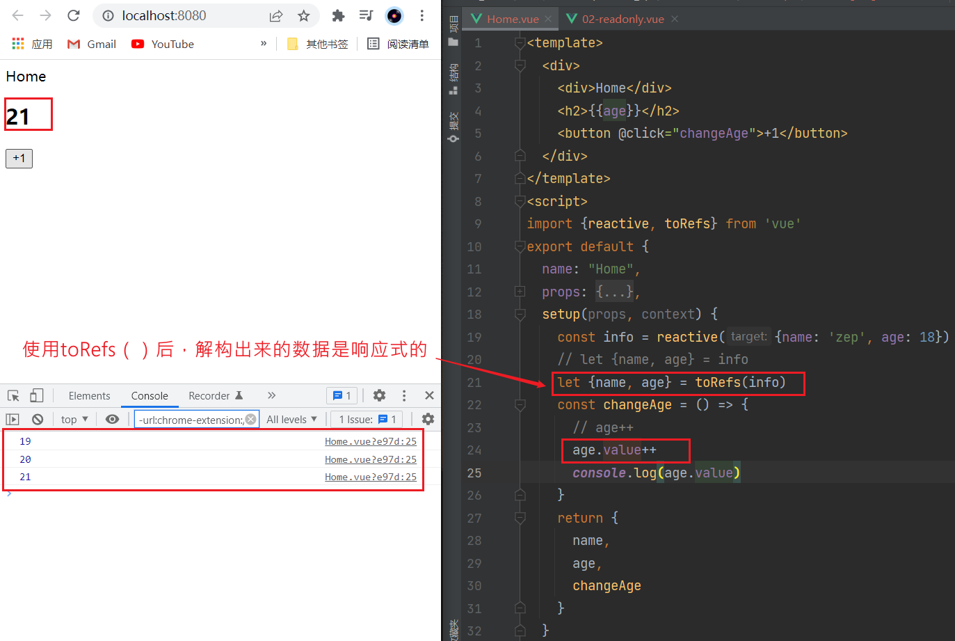- 那么我们再次进行结构出来的 name 和 age 本身都是 ref的;