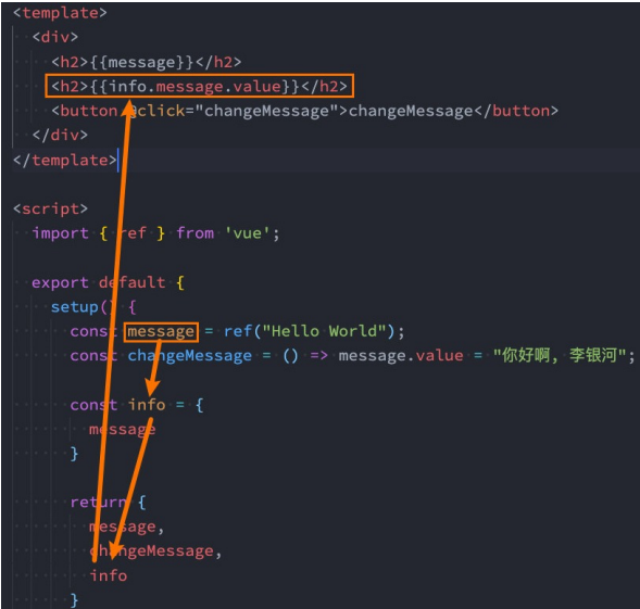最新版本的vue中已经支持在template中直接写info.message这种方式,一样可以自动解包