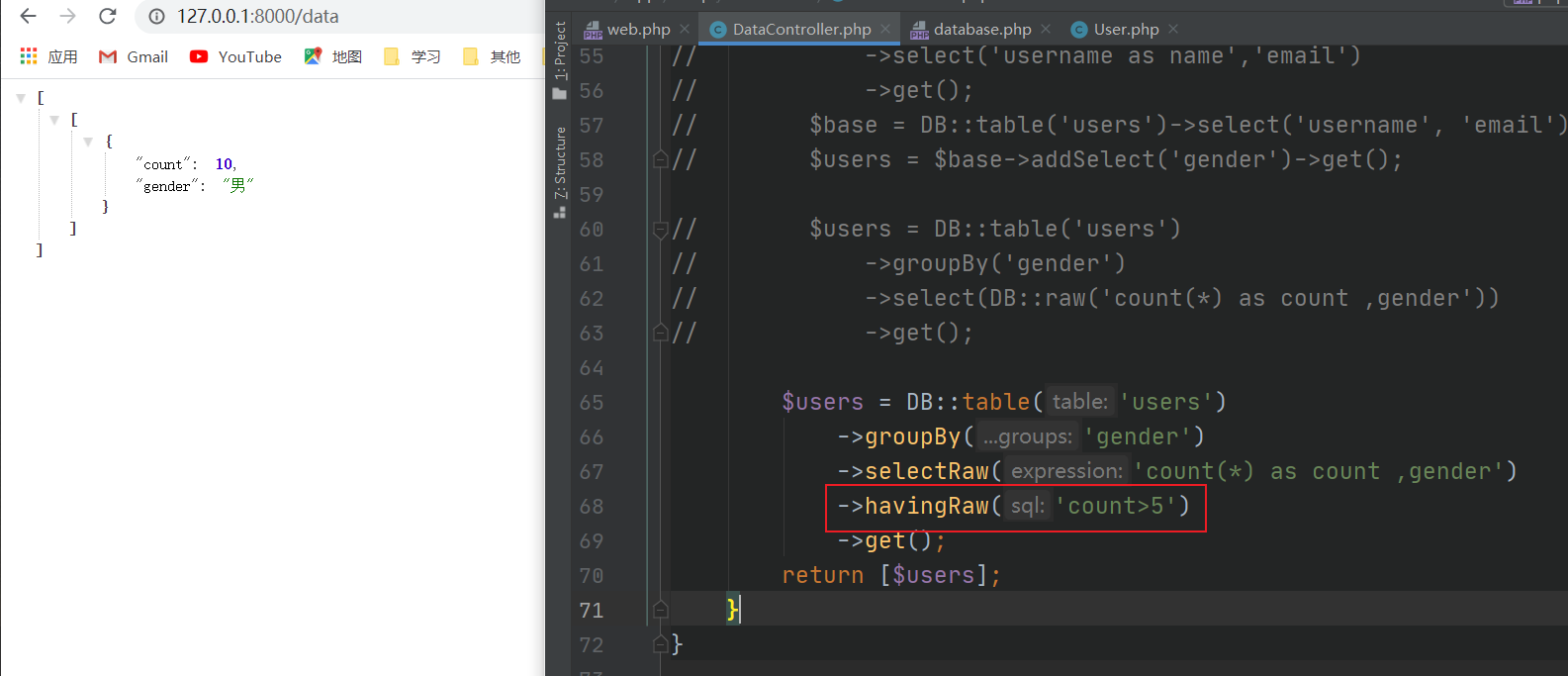 - DB::raw()方法可以在 select()内部实现原生表达式,否则解析错误;