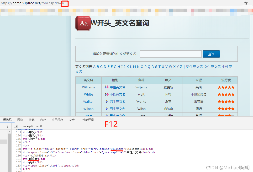 import urllib.requestdef getename(ename_data='ename2cname.txt'):flag = "jerry.asp?id="  # 特定标记位置url = 'https://name.supfree.net/tom.asp?id='alphas = [chr(x) for x in range(ord('a'), ord('z') + 1)]with open(ename_data, 'w', encoding='utf-8') as f:for alpha in alphas:  # 名字首字母req = urllib.request.Request(url + alpha)req.add_header('User-Agent', 'Mozilla/6.0')try:res = urllib.request.urlopen(req)except:print("error")# code = res.getcode()html = res.read().decode('ANSI')  # 有的网页是 utf-8contents = html.split("\n")  # 按行切分def gen_func():for x in contents:yield xgen = gen_func()  # 生成器for x in gen:if flag in x:l = x.find(flag)r = x.find('"', l)ename = x[l + len(flag):r]print("ename: ", ename)x = gen.__next__()x = gen.__next__()x = gen.__next__()cname = x[4:-6]print("cname: ", cname)print('----------')f.write(ename + '\t' + cname + '\n')time.sleep(0.05)res.close()# print('网页状态码:%s' % (code))# print('网页内容:' + html)if __name__ == '__main__':getename()