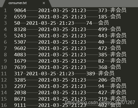 with open("consumer.txt",'w',encoding='utf-8') as f:for i in range(1000): # 1000条数据random.seed(time.time()+i)id = random.randint(0, 10000)t = time.strftime('%Y-%m-%d %H:%M',time.localtime(time.time()))value = random.randint(1, 500)type = consumer_type[random.randint(0, 1)]f.write(str(id)+'\t'+t+'\t'+str(value)+'\t'+type+'\n')if type == consumer_type[0]:vip += 1vipValue += valueelse:novip += 1novipValue += value