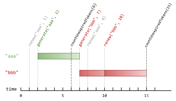 如果一个验证码在时刻 t 过期,且另一个操作恰好在时刻 t 发生(renew 或者 countUnexpiredTokens 操作),过期事件 优先于 其他操作。