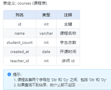 请编写 SQL 语句,查询 courses 表中,课程名首两个字母在 ‘Db’ 和 ‘Dy’ 之间所有课程的名称