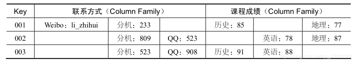 列族最早在 Google 的 BigTable 中使用,这是一种面向列族的稀疏矩阵存储格式,如下图所示。