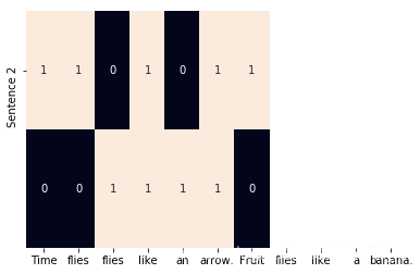 sns.heatmap(one_hot, annot=True,cbar=False, xticklabels=vocab, yticklabels=['Sentence 2'])