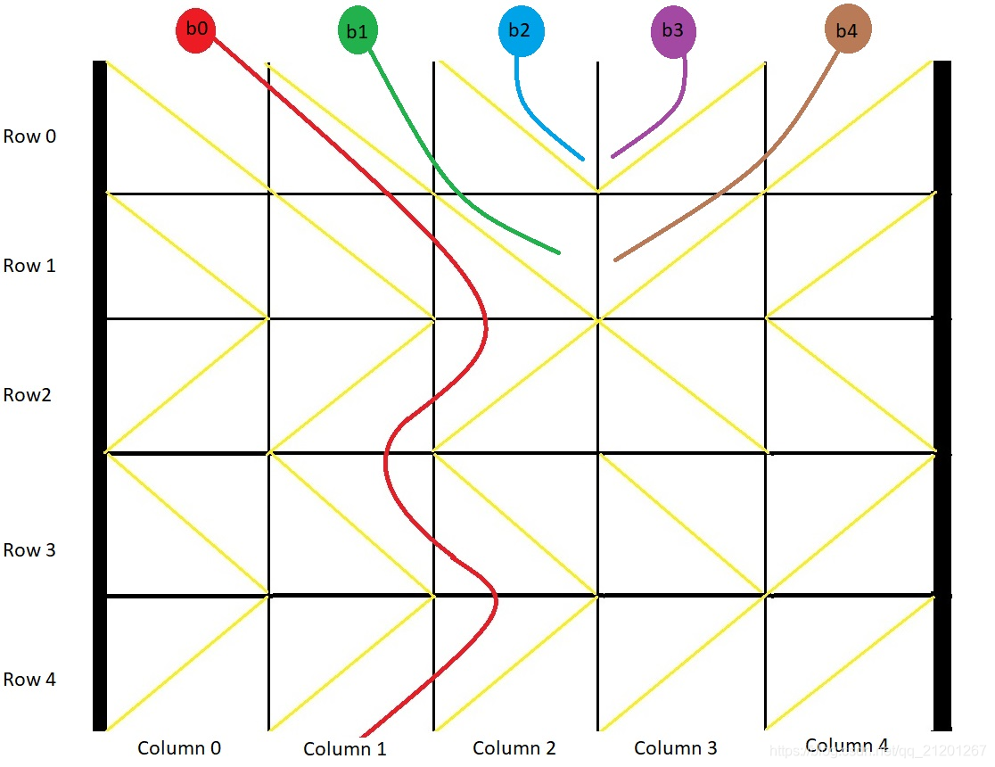 b0 球开始放在第 0 列上,最终从箱子底部第 1 列掉出。
