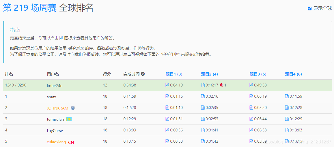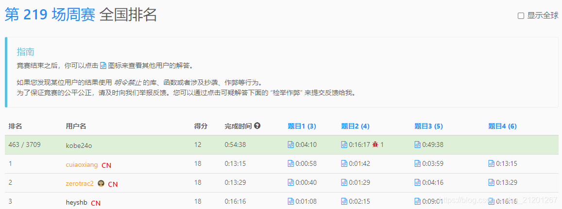 public:int maxHeight(vector<vector<int>>& cub) {vector<vector<int>> C(6, vector<int>(3));C[0] = {0,1,2};C[1] = {0,2,1};C[2] = {1,0,2};C[3] = {1,2,0};C[4] = {2,0,1};C[5] = {2,1,0};//最后一维是高度维for(auto& c : cub)sort(c.begin(), c.end());sort(cub.begin(), cub.end());int n = cub.size();vector<vector<int>> dp(n, vector<int>(6, 0));dp[0][0] = cub[0][C[0][2]];dp[0][1] = cub[0][C[1][2]];dp[0][2] = cub[0][C[2][2]];dp[0][3] = cub[0][C[3][2]];dp[0][4] = cub[0][C[4][2]];dp[0][5] = cub[0][C[5][2]];for(int i = 1; i < n; ++i){for(int c1 = 0; c1 < 6; ++c1){dp[i][c1] = cub[i][C[c1][2]];//初始化为自己的高度for(int j = 0; j < i; ++j){for(int c2 = 0; c2 < 6; ++c2){ if(cub[j][C[c2][0]] <= cub[i][C[c1][0]]&& cub[j][C[c2][1]] <= cub[i][C[c1][1]]&& cub[j][C[c2][2]] <= cub[i][C[c1][2]]){dp[i][c1] = max(dp[i][c1], dp[j][c2]+cub[i][C[c1][2]]);}}}}}int ans = 0;for(int i = 0; i < n; i++){for(int k = 0; k < 6; k++){ans = max(ans, dp[i][k]);}}return ans;}