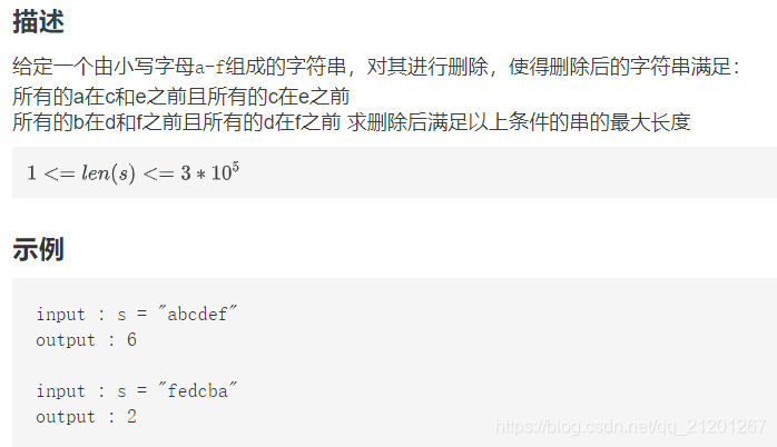 public:/*** @param s: write your code here* @return: The longest length that satisfies the condition*/int conditionString(string &s) {// write your code herestring s1, s2;for(char c : s){if(c == 'a' || c == 'c' || c == 'e')s1 += c;elses2 += char(c-1);}return s.size()-f(s1)-f(s2);}int f(string &s){int n = s.size();if(n == 0)return 0;vector<vector<int>> dp(n,vector<int>(3, INT_MAX));// 求以某个字符结尾时,满足要求的,删除的最小次数dp[0][0] = s[0]=='a' ? 0 : 1;dp[0][1] = s[0]=='c' ? 0 : 1;dp[0][2] = s[0]=='e' ? 0 : 1;for(int i = 1; i < n; ++i){if(s[i] == 'a'){dp[i][0] = dp[i-1][0];dp[i][1] = 1+min(dp[i-1][0], dp[i-1][1]);dp[i][2] = 1+min(dp[i-1][0], min(dp[i-1][1], dp[i-1][2]));}else if(s[i] == 'c'){dp[i][0] = 1+dp[i-1][0];dp[i][1] = min(dp[i-1][0], dp[i-1][1]);dp[i][2] = 1+min(dp[i-1][0], min(dp[i-1][1], dp[i-1][2]));}else{dp[i][0] = 1+dp[i-1][0];dp[i][1] = 1+min(dp[i-1][0], dp[i-1][1]);dp[i][2] = min(dp[i-1][0], min(dp[i-1][1], dp[i-1][2]));}}return min(dp[n-1][0],min(dp[n-1][1], dp[n-1][2]));}