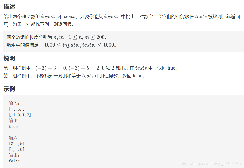 public:/*** @param inputs: an integer array* @param tests: an integer array* @return: return true if sum of two values in inputs are in tests.*/bool addAndSearch(vector<int> &inputs, vector<int> &tests) {// write your code here.unordered_set<int> s(tests.begin(), tests.end());for(int i = 0, j; i < inputs.size(); ++i){for(j = i+1; j < inputs.size(); ++j){if(s.count(inputs[i]+inputs[j]))return true;}}return false;}