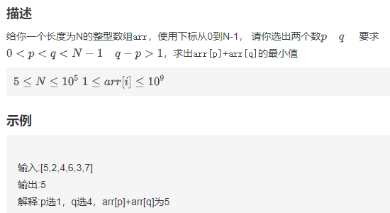 public:/*** @param arr: an inter array * @return: return the min sum*/int splitArray(vector<int> &arr) {// write your code hereint mins = INT_MAX, prevMin = arr[1];for(int i = 2, j = 3; j < arr.size()-1; ++j){mins = min(mins, prevMin + arr[j]);//隔一个数之前的所有最小值,跟当前的组合prevMin = min(prevMin, arr[i++]);//更新最小值}return mins;}