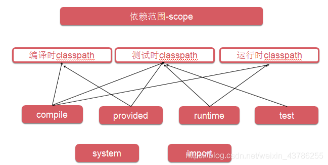 (3)provided ①main目录下的Java代码可以访问这个范围的依赖 ②test目录下的Java代码可以访问这个范围的依赖 ③部署到Tomcat服务器上运行时不会放在WEB-INF的lib目录下 如:servlet-api在服务器上运行时,Servlet容器会提供相关API,所以部署的时候不需要。
