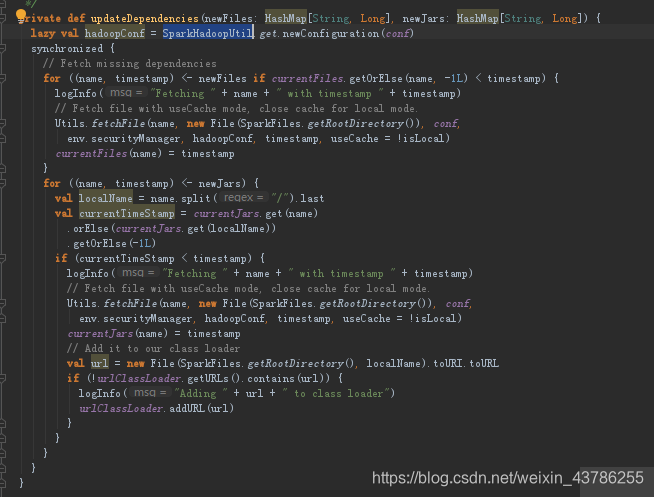 进入到updateDependencies方法中。这里下载我们task运行需要的所有依赖文件,获得hadoop的Configuration。这里下载文件用了synchronized关键字,因为我们每一个taskrunner运行在线程中,这个方法会被多个线程调用,方法在全局中,所以需要加锁。下载文件,所有的依赖都有之后就反序列化任务即task本身。