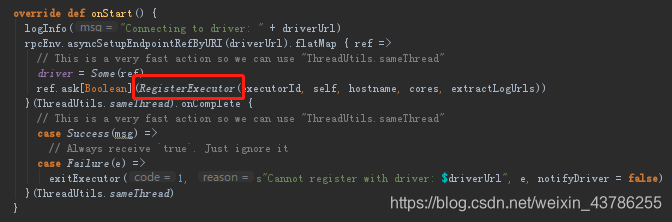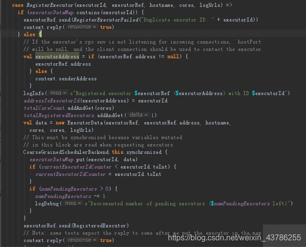 CoarseGrainedSchedulerBackend.this.synchronized这里加上synchronized是因为集群中有很多ExecutorBackend向Driver注册,担心注册的时候写冲突,所以加上一个同步代码块