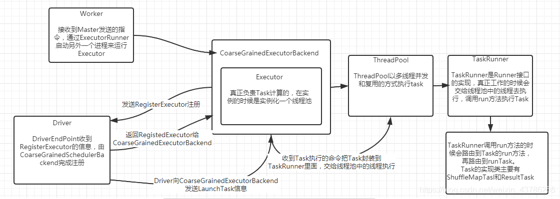 (1)Worker接收到Master发送过来启动Executor的指令,通过ExecutorRunner启动另外一个进程来运行Executor。在这个基础上会启动一个CoarseGrainedExecutorBackend(粗粒度),ExecutorBackend启动的时候这个时候要向Driver注册,通过RegisterExecutor。Driver(CoarseGrainedSchedulerBackend的内部成员DriverEndpoint接收注册)在接收到RegisterExecutor信息后会返回一个信息RegisteredExecutor给CoarseGrainedExecutorBackend。