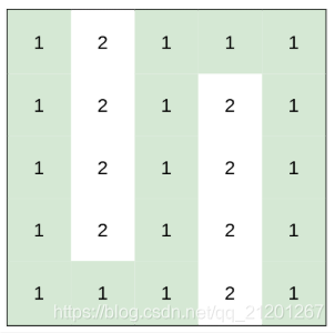 输入:heights = [[1,2,1,1,1],[1,2,1,2,1],[1,2,1,2,1],[1,2,1,2,1],[1,1,1,2,1]]
