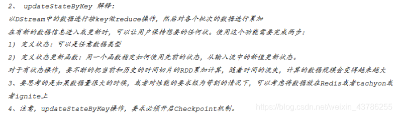 | updateStateByKey(func) | 根据key的前置状态和key的新志,对比key进行更新,返回一个新状态的DStream |